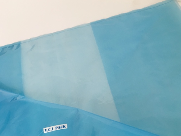 VCI氣相防銹膜(防銹袋)是將高分子聚乙烯樹脂(LDPE)與功能VCI樹脂配比混合,采用現(xiàn)代薄膜共擠技術(shù)生產(chǎn)的新一代復(fù)合防銹薄膜。具有良好的氣化防銹性能、阻隔防潮、使用方便、透明直觀等特點(diǎn);當(dāng)用塑料袋包裹金屬產(chǎn)品時(shí),氣相緩蝕劑在封閉空間內(nèi)氣化并凝聚在所有金屬表面上形成氣相保護(hù)層,從而防止金屬產(chǎn)品銹蝕。符合GB-T19532-2004防銹性能要求。